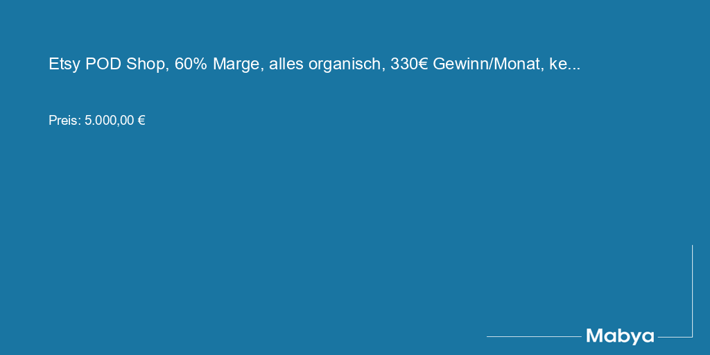 Etablierter Etsy-Shop für personalisierte Print-On-Demand-Poster mit über zwei Jahren organischem Wachstum. Der Shop erzielt stabile Bestellungen ohne Werbekosten, besitzt starke SEO-Sichtbarkeit und viele Designs ranken seit Jahren auf Seite 1. Mit einer Gewinnmarge von rund 60 % und sehr geringem Zeitaufwand pro Bestellung bietet das Geschäft eine attraktive, risikoarme Einstiegsmöglichkeit mit klarem Skalierungspotenzial durch Sortimentserweiterung und internationale Listungen.