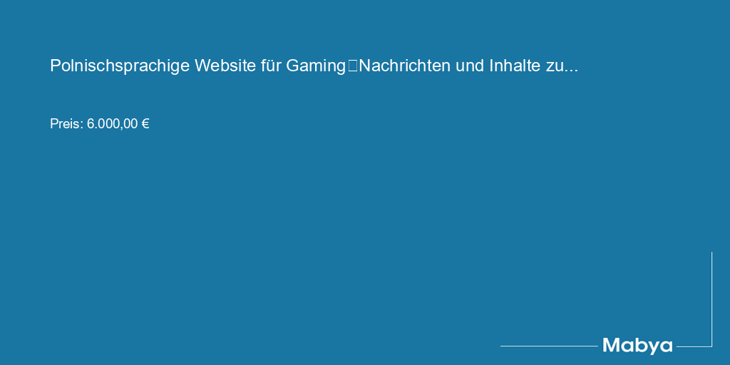 Der Preis ergibt sich aus dem Alter und der sauberen Historie der Website, ihrer langfristigen Beständigkeit innerhalb der Gaming-Nische sowie ihrer starken Basis als skalierbares Content-Asset. Das Projekt lässt sich unkompliziert erweitern und monetarisieren zum Beispiel durch Display-Werbung, Affiliate-Programme rund um Spiele und Gaming-Hardware, gesponserte Inhalte oder durch den Aufbau zusätzlicher Kanäle wie Videoplattformen, Newsletter oder community-getriebene Initiativen. Damit stellt es eine attraktive Übernahmegelegenheit für einen Investor oder Publisher dar, der eine verlässliche Grundlage sucht, um ein gaming-fokussiertes Medienprojekt ohne Neuanfang zu skalieren.