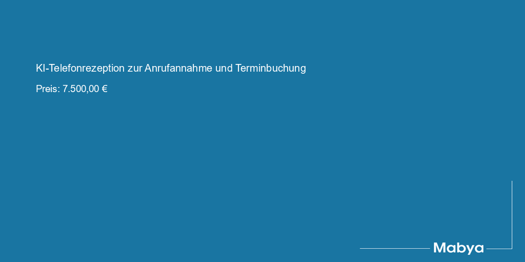 B2B-SaaS-Lösung für kleine und mittelständische Unternehmen: Diese KI-basierte Telefonrezeption bietet zuverlässige Anrufannahme und automatische Terminbuchung und wird als monatliches Abonnement pro Standort oder pro Nutzer angeboten. Optional sind nutzungsbasierte Gebühren pro Anruf oder Minute möglich, abhängig von Telefonie- und KI-Kosten. Das Produkt ist vollständig funktionsfähig und schlüsselfertig, sodass Übernahme, Betrieb und Markteinführung sofort erfolgen können. Der geforderte Preis reflektiert den umfangreichen Entwicklungsaufwand, die vorhandene Produktreife und die erhebliche Zeitersparnis für den Käufer, da mehrere Wochen bis Monate Entwicklungszeit entfallen und direkt mit Vertrieb und Kundenaufbau begonnen werden kann.